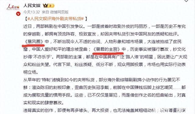 人民文娱点名批评两部韩剧夹带私货,分别是由少女时代成员林允儿主演的“偷中餐文化”和“贬低大明”的新剧《暴君的主厨》,以及全智贤主演的“台词辱华”和“偷古诗文化”的《暴风圈》,不难发现,现在韩国是谁火就让谁来偷文化,不仅如此,“偷文化”和“抹黑中国”已经成为了韩剧的流量密码,林允儿和全智贤都没能顶住诱惑。